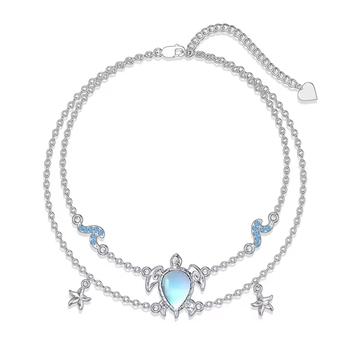 Ocean Theme 925 Sterling Silver Double Layer Chain Starfish Moonstone Sea Turtle Anklets